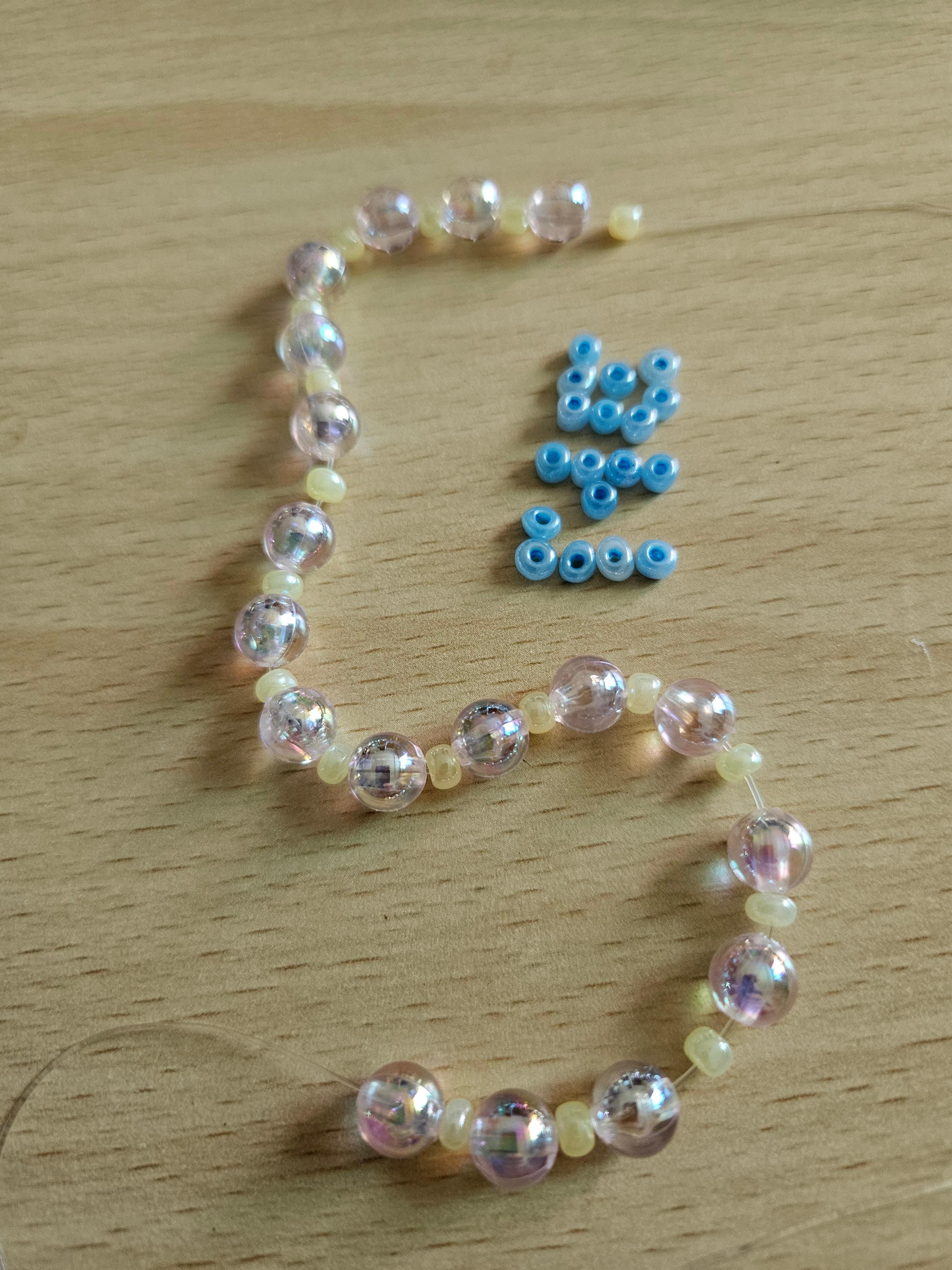손목 둘레보다 약 5cm 길게 낚싯줄이나 우레탄줄을 잘라서 사용할수 있지만 줄에서 그대로 끼워서 사용해야 편해요, 다 끼우고 손목에 맞혀보고 줄을 자르셔요. 자를때 여유가 있어야 매듭을 쉽게 지을 수 있습니다. - 비즈 꿰기